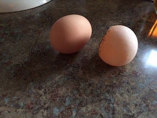 Two of the three eggs I found this morning. The one on the right is called a jello egg as the shell is super soft. The other one was dropped by the feeder and was another jello egg, so this tells me they are starting to lay and trying to get it right. I might need to boost their calcium intake a bit, although Penny has been laying eggs for a month now and they are getting larger all the time.